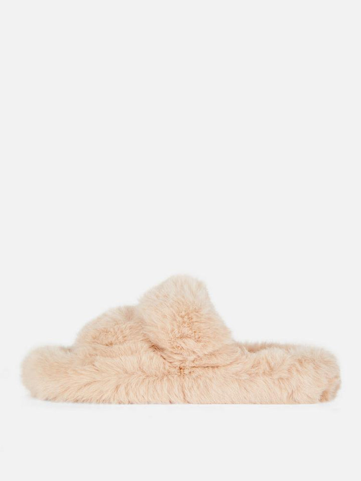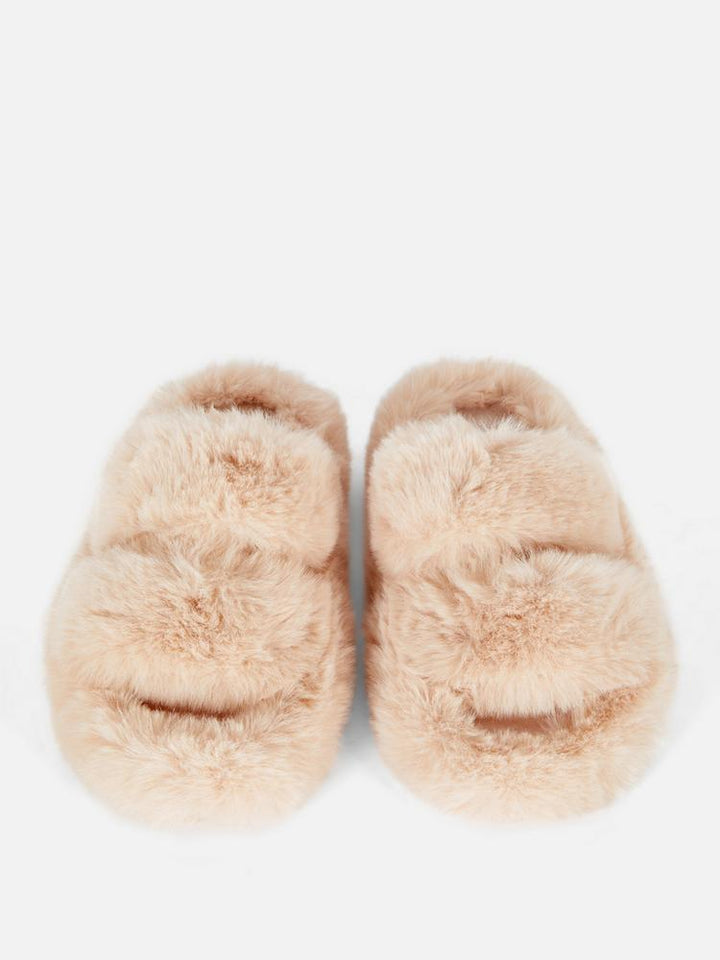 PRIMARK FLUFFY DOUBLE STRAP SLIPPERS IN BEIGE