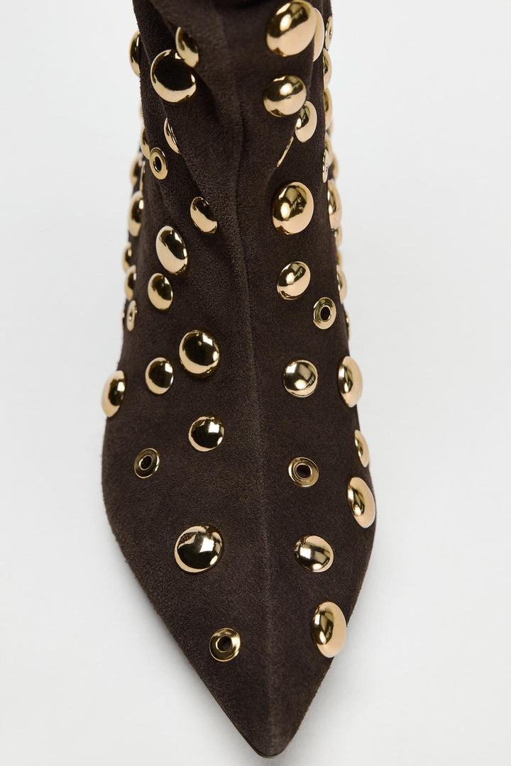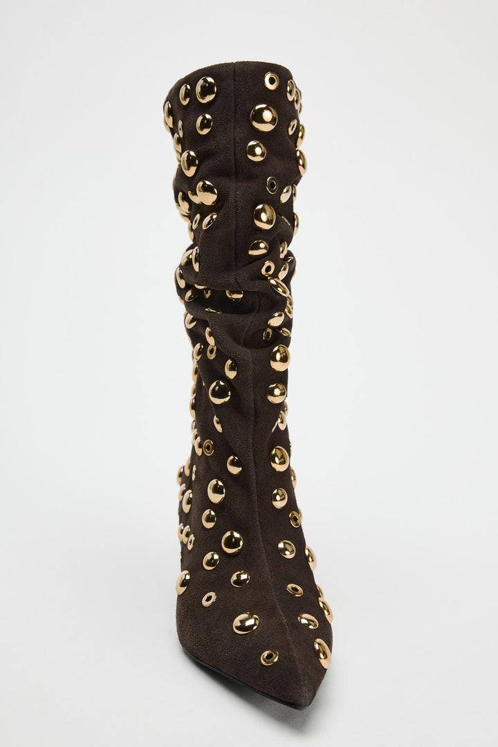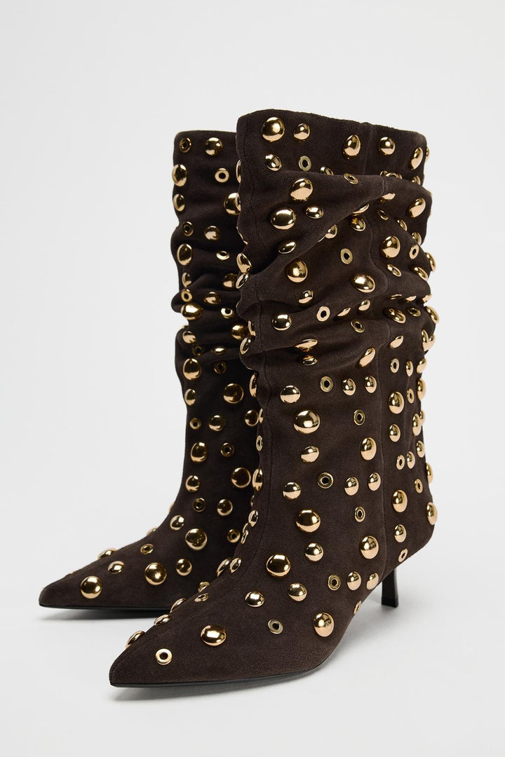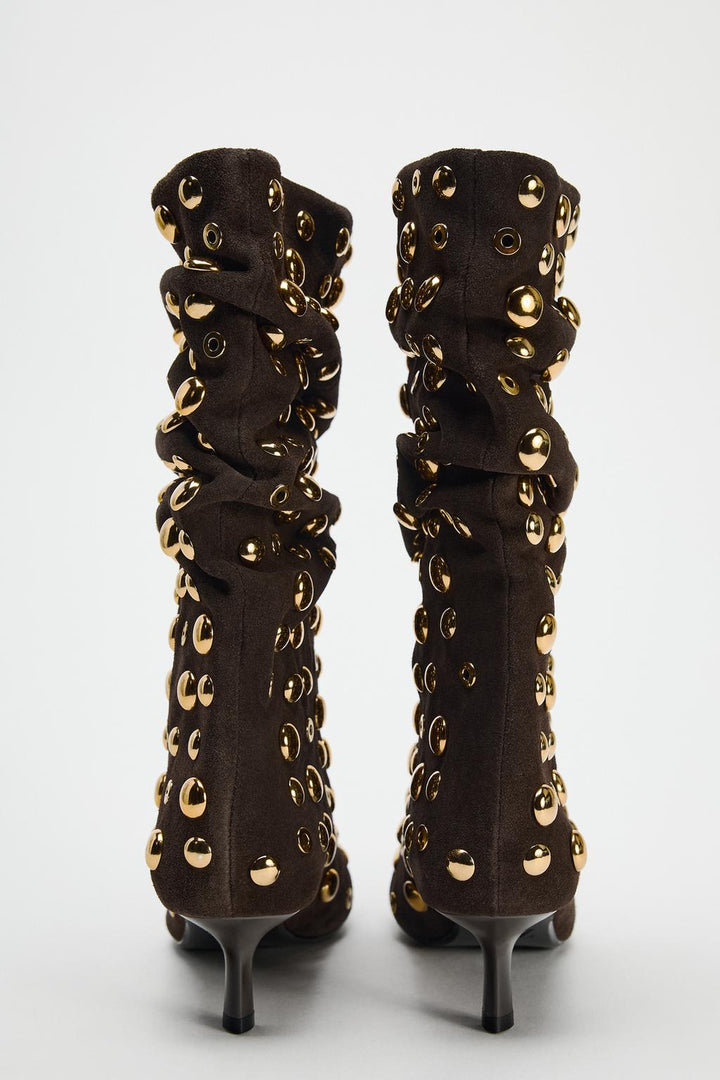 ZARA SUEDE ANKLE BOOT WITH A mid-heel. Studs along the upper and gathers along the leg. Pointed toe 3138/410/700