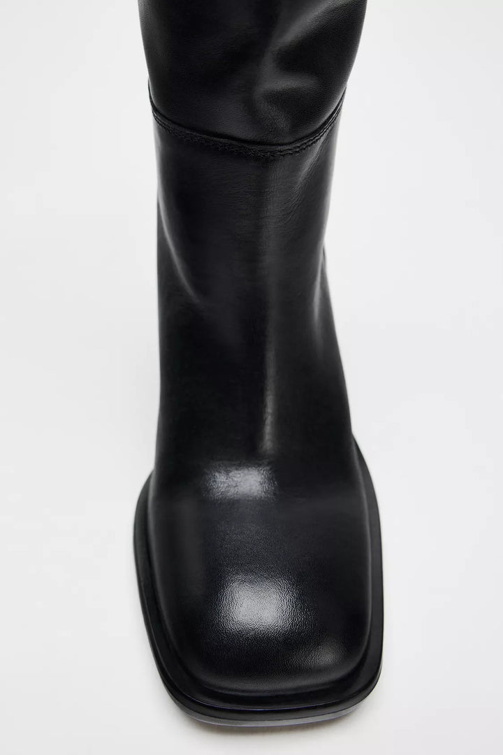 - Tall leather boots with decorative stitching. Wide heel, square toe.