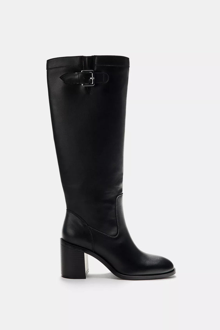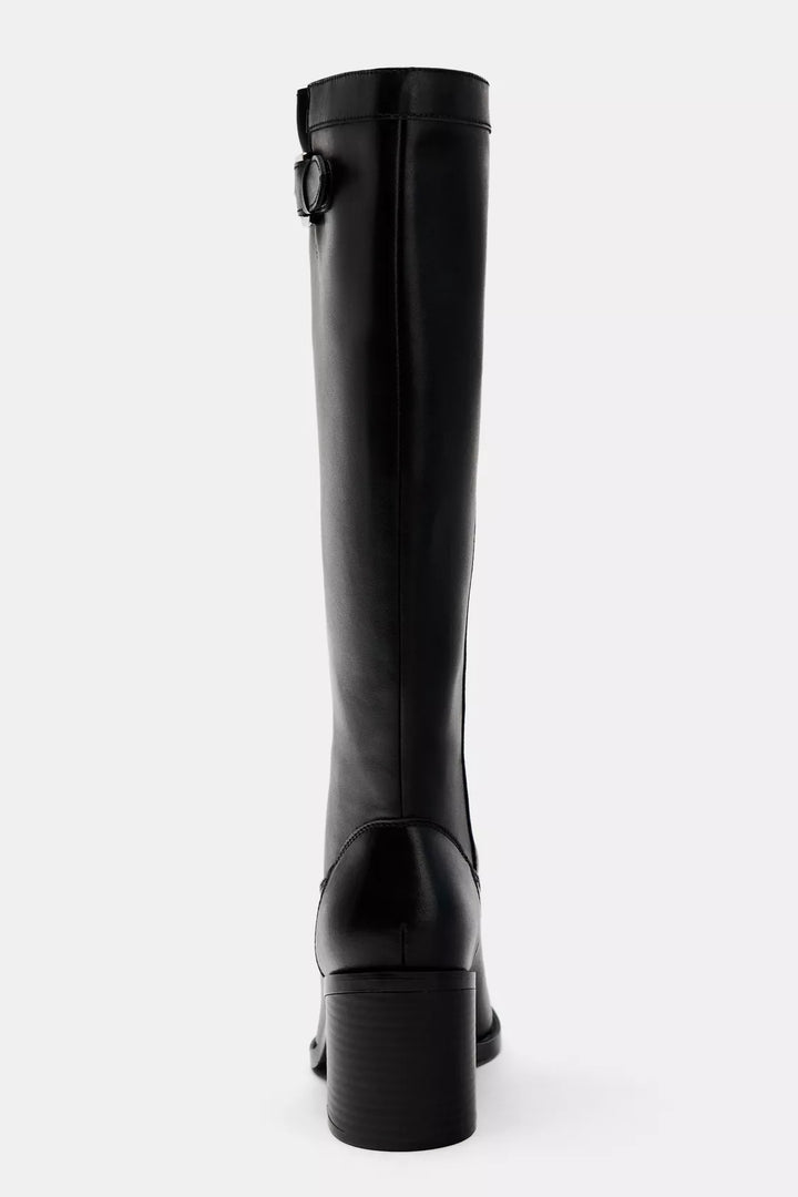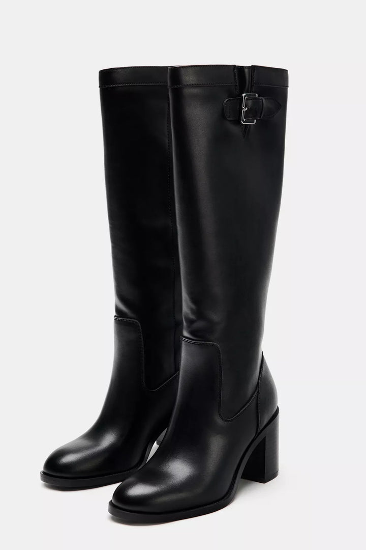 - Heeled boots with a block heel. Knee-high leg. Buckle detail on the top of the leg. Pointed toe.